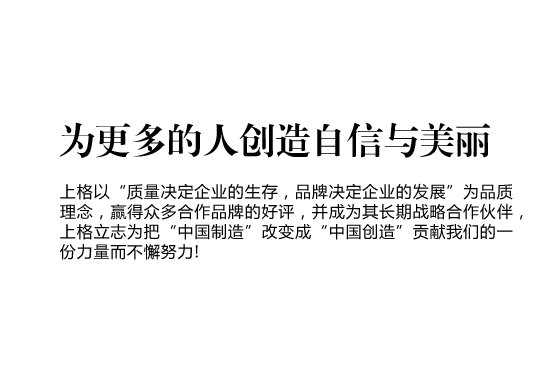 上格一路走來,以“締造時尚集團,使公司受人尊敬,令人向往;為客戶提升價值,創(chuàng)造成功;讓員工提高生活品質(zhì),實現(xiàn)自我價值”作為我們的目標,“為更多的創(chuàng)造自信與美麗” 作為我們的使命,立志為把“中國制造” 改變成“中國創(chuàng)造”貢獻我們的一份力量而不懈努力!